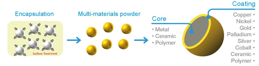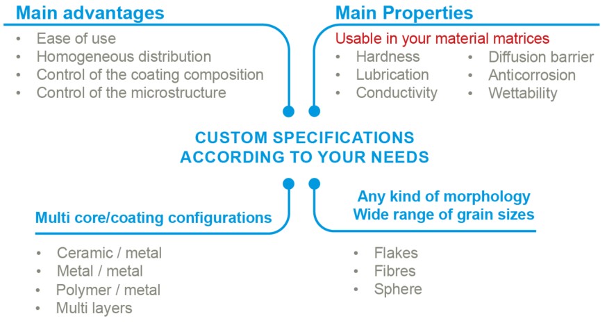 For over 20 years, HEF has specialized in the functionalization of high value-added powders. We develop functional powders based on your specifications for your applications in additive manufacturing, sintering, Cold Spray… Our multi-material powders are obtained through dry processes (PVD, OMCVD, thermochemistry…) or wet processes (electroless, sol-gel…). We offer complete or partial functionalizations, or inclusions within the core of your base powder.